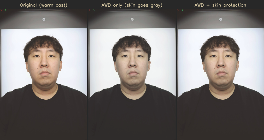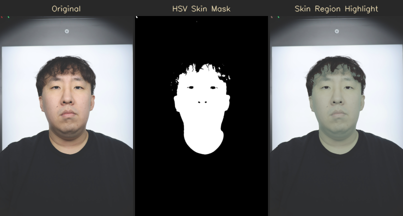 뺨을 측정 기준으로 선택한 이유가 있다. 이마나 코는 조명의 직접적인 반사가 발생하기 쉽고, 턱 아래는 그림자가 진다. 뺨은 얼굴에서 비교적 넓고 평탄한 영역이라, 조명 반사와 그림자의 영향을 가장 적게 받으면서 피부 톤의 대표값을 얻을 수 있다.