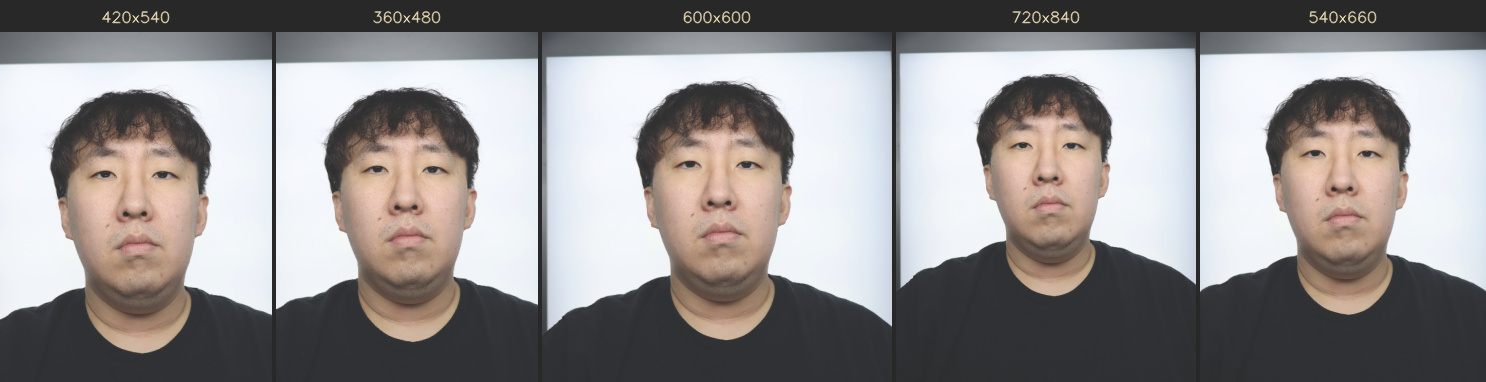 증명사진은 규격이 정해져 있다. 420x540, 360x480, 600x600 등 5개 프리셋 크기에 맞춰 크롭해야 하며, 얼굴이 프레임 내 적절한 위치와 크기로 배치되어야 한다.