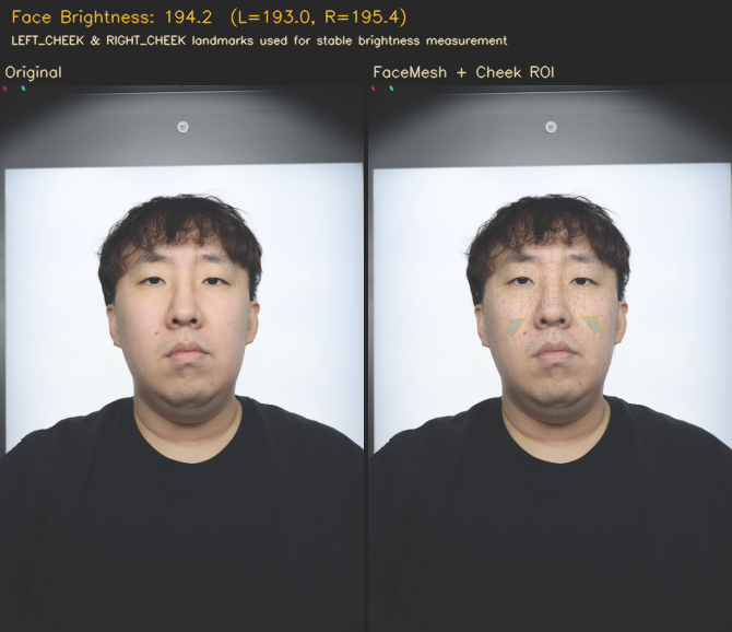 MediaPipe FaceMesh로 얼굴 랜드마크를 검출하고, 양쪽 뺨 영역의 밝기를 직접 측정한다.