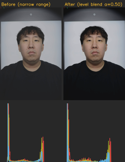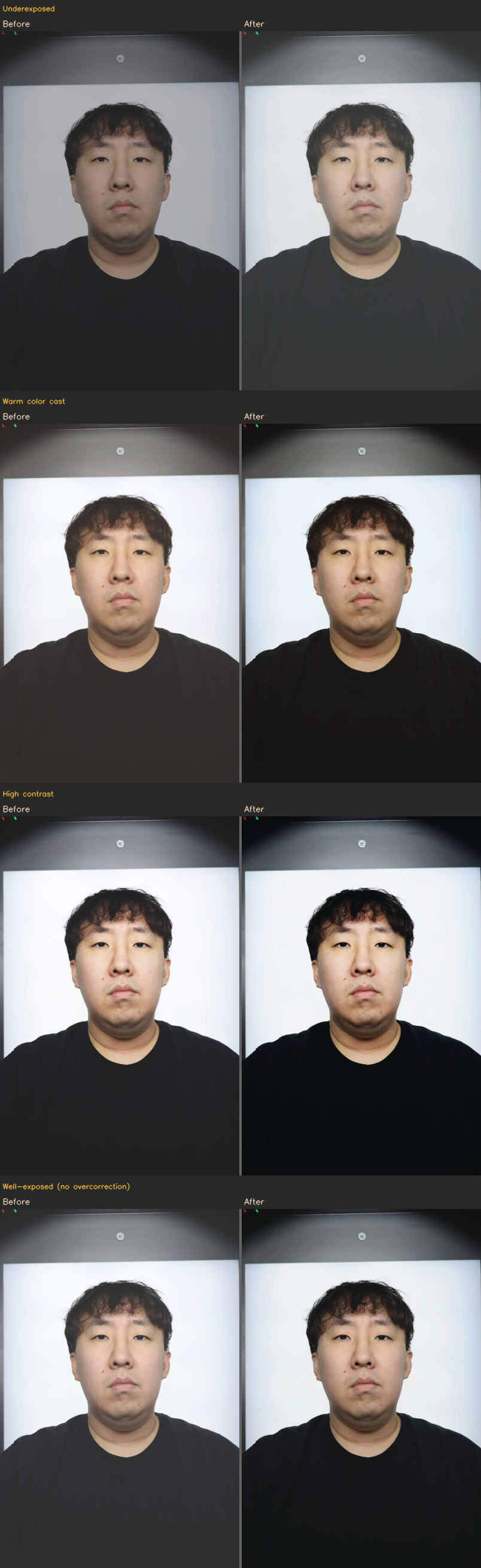 전체 이미지의 평균 밝기로 보정량을 결정하면, 실제 중요한 영역인 얼굴과 무관한 결과가 나온다. 어두운 배경에 밝은 얼굴이 있는 이미지는 "어둡다"로 분류되어 과도하게 밝아지고, 밝은 배경에 어두운 얼굴이 있으면 반대로 더 어두워진다. 증명사진에서 중요한 것은 배경이 아니라 얼굴의 밝기다.