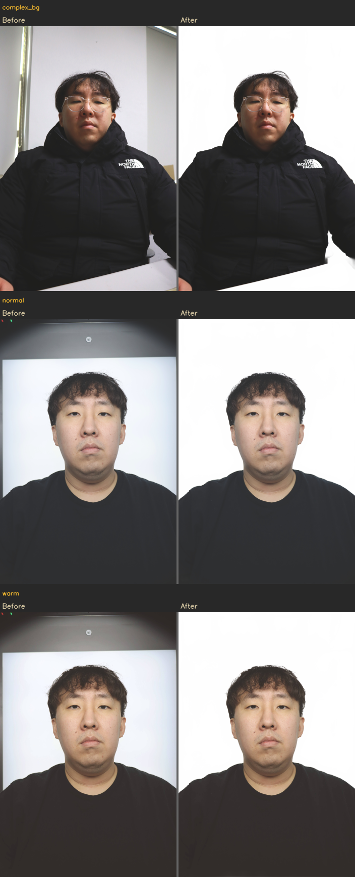 증명사진의 배경을 흰색으로 교체해야 한다. 배경이 복잡하거나 머리카락처럼 경계가 세밀한 영역에서 깔끔하게 분리하는 것이 관건이다.