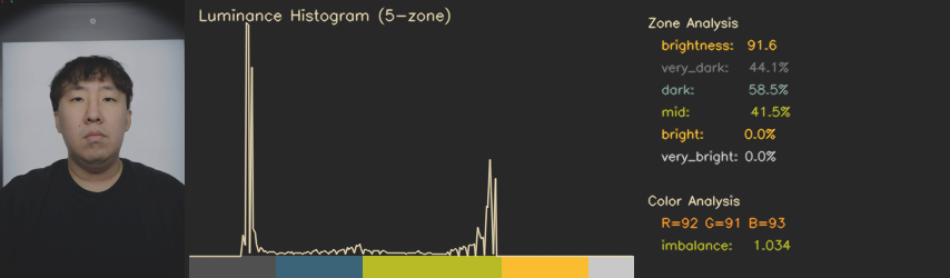 모든 보정에 앞서 analyze() 함수가 이미지의 밝기 분포와 색 특성을 수치화한다. 밝기를 5개 존으로 나누어 분포를 측정하고, R/G/B 채널 간 비율로 컬러 불균형 지수를 산출한다.